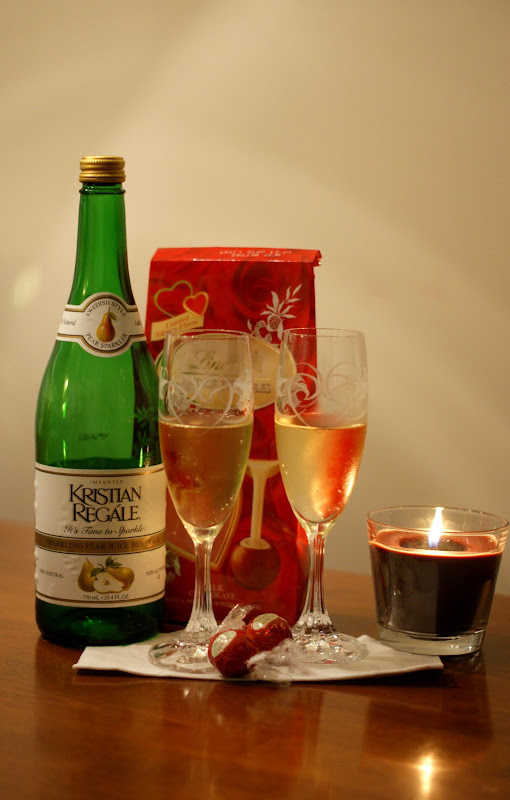 Lindt truffles and sparkling pear juice from IKEA in our wedding flutes made for a very special Valentine's Day treat.